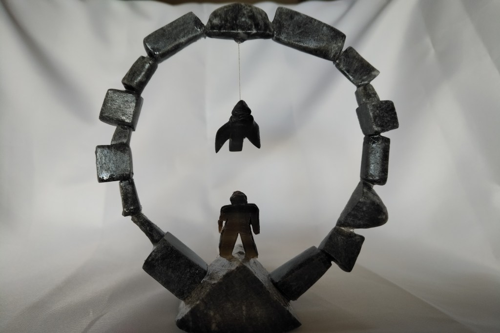 The Catch. The figure and the seal are from one block of stone and the kayak is from a different one.