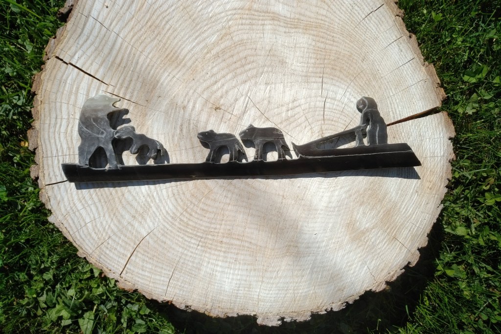Nanook 1, dogs 0. Carved from Bowhead Whale baleen plate. (2020)